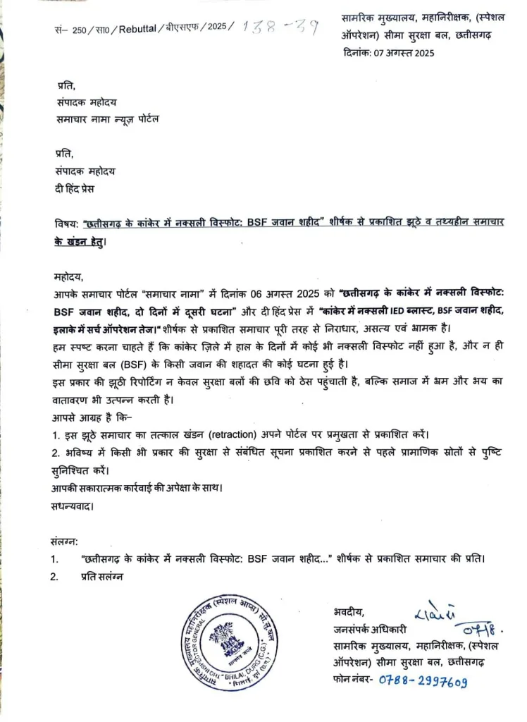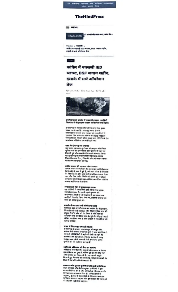 छत्तीसगढ़“छत्तीसगढ़ के कांकेर में नक्सली विस्फोट : बीएसएफ जवान शहीद” शीर्षक से प्रकाशित झूठे व तथाहीन समाचार का खंडन। Gokul Sahu7 months ago7 months ago01 mins Post navigation Previous: राखी विद रक्षक: जवानों की कलाई पर बहनों का स्नेह, रक्षाबंधन पर भावुक हुआ हर चेहराNext: लोन दिलाने के नाम पर लाखों की ठगी, महिला आरोपी गिरफ्तार Leave a Reply Cancel replyYour email address will not be published. Required fields are marked *Comment * Name * Email * Website Save my name, email, and website in this browser for the next time I comment.