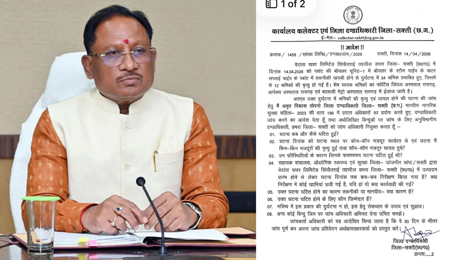 छत्तीसगढ़ के सक्ती जिले के सिंघीतराई स्थित वेदांता पावर प्लांट में हुए हादसे के बाद मुख्यमंत्री विष्णु देव साय ने मजिस्ट्रियल जांच के निर्देश दिए हैं। इस संबंध में कलेक्टर एवं जिला दंडाधिकारी द्वारा औपचारिक आदेश जारी कर जांच प्रक्रिया शुरू कर दी गई है।